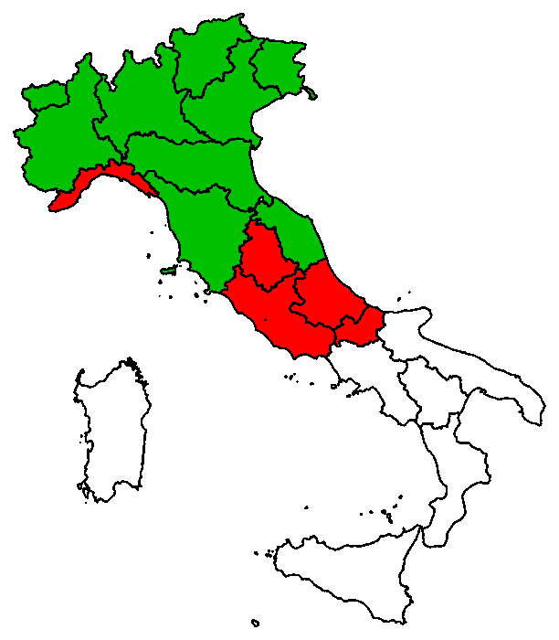 Abruzzo: segnalazione erronea / recorded by mistake; Emilia-Romagna; Friuli Venezia Giulia; Lazio: segnalazione erronea / recorded by mistake; Liguria: segnalazione erronea / recorded by mistake; Lombardia; Marche; Molise: segnalazione erronea / recorded by mistake; Piemonte; Trentino-Alto Adige; Toscana; Umbria: segnalazione erronea / recorded by mistake; Valle d'Aosta; Veneto;