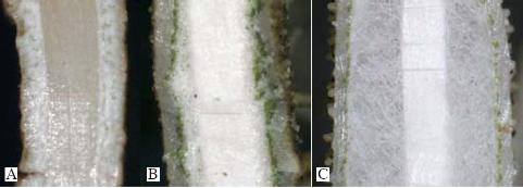 Fig. 9a: Medulla A) compatta, B) densa, C) lassa