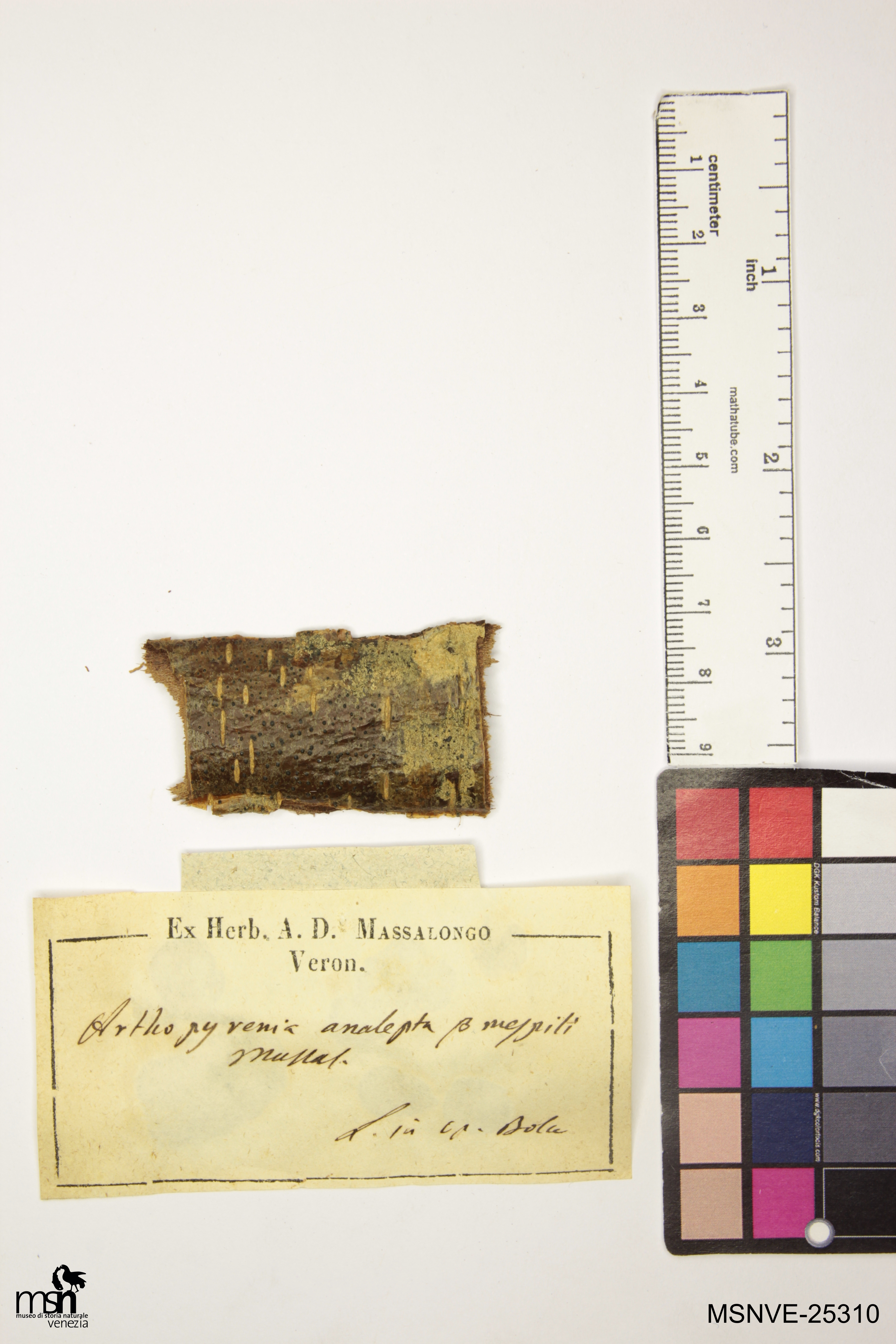 Trascrizione del cartellino verbatim: Arthopyrenia analepta β mespili Massal. L. in op. Bolca
