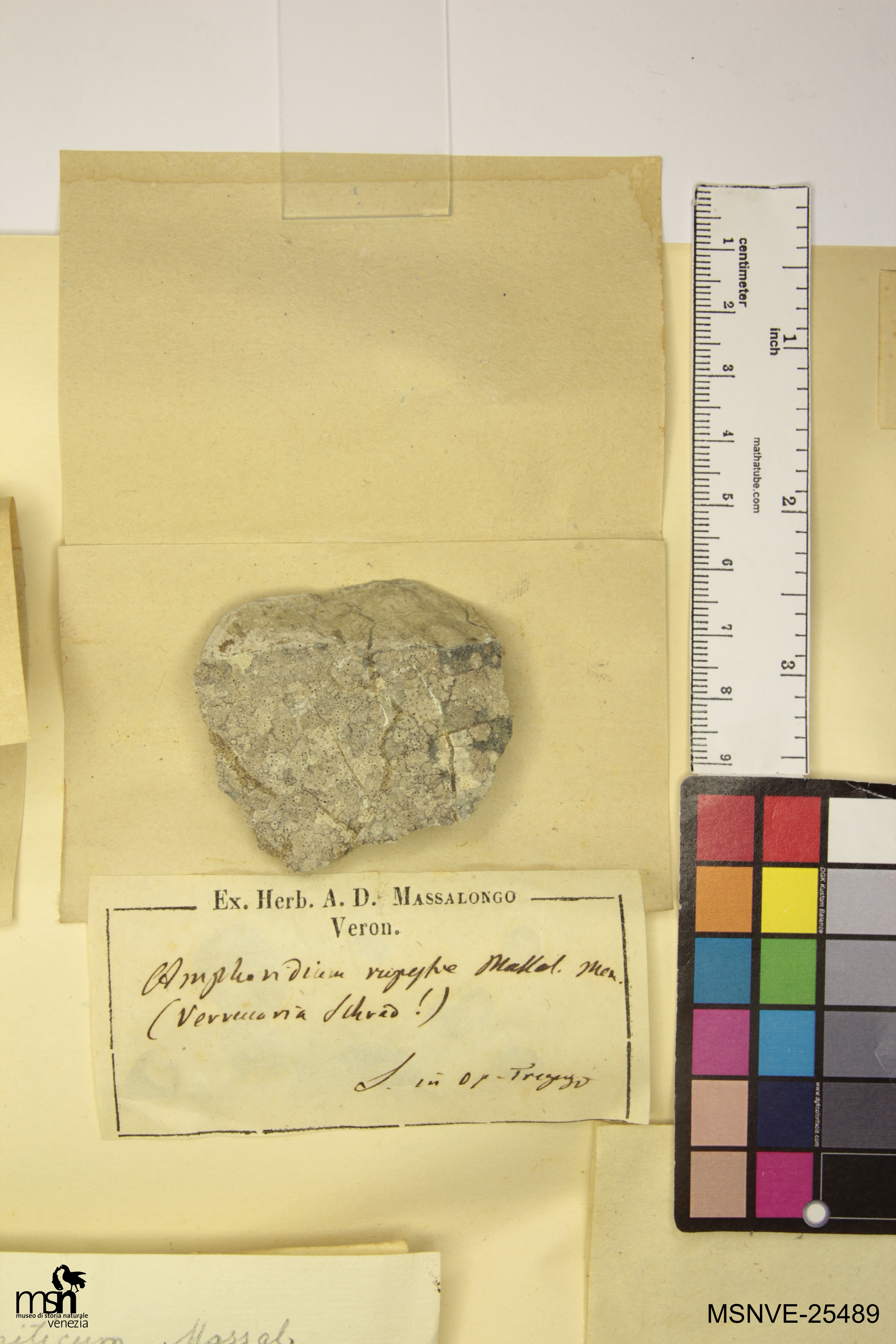 Trascrizione del cartellino verbatim: Amphoridium rupestre Massal. (Verrucaria Schrad!) Mem. L. in op. Tregnago