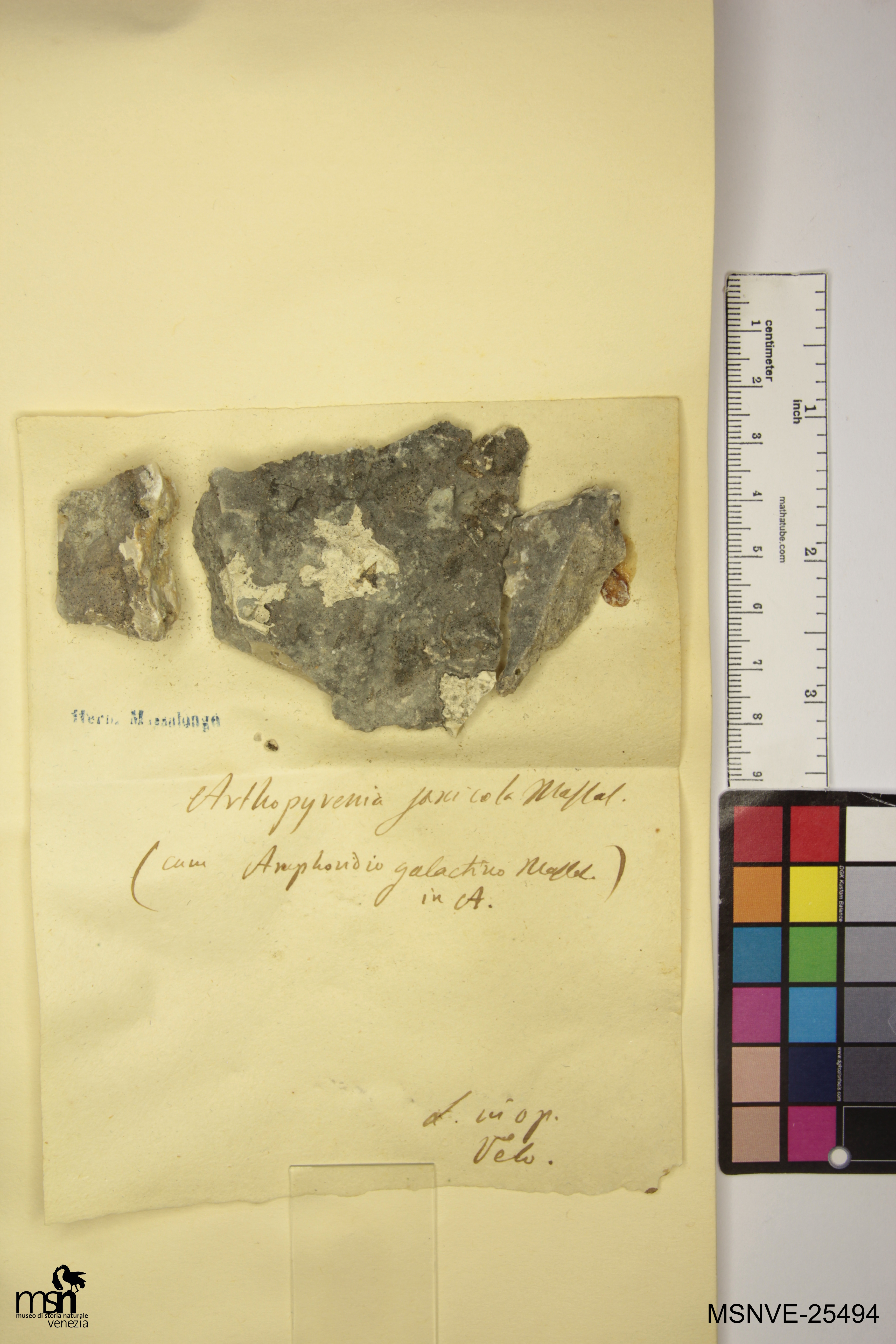 Trascrizione del cartellino verbatim: Arthopyrenia saxicola Massal. (cum Amphoridio galactino Massal. in A.) L. in op. Velo