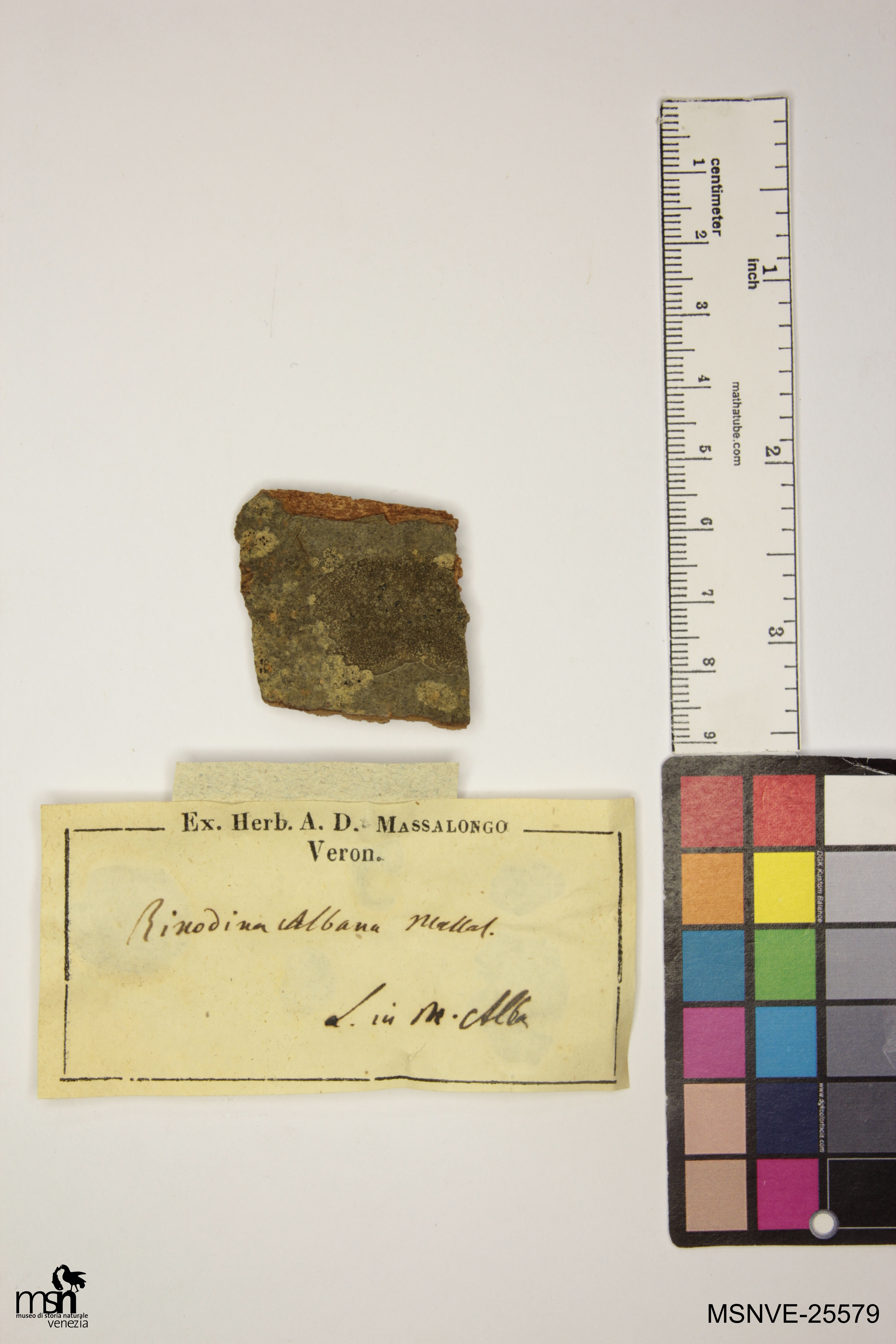 Trascrizione del cartellino verbatim: Rinodina Albana Massal. L. in M. Alba