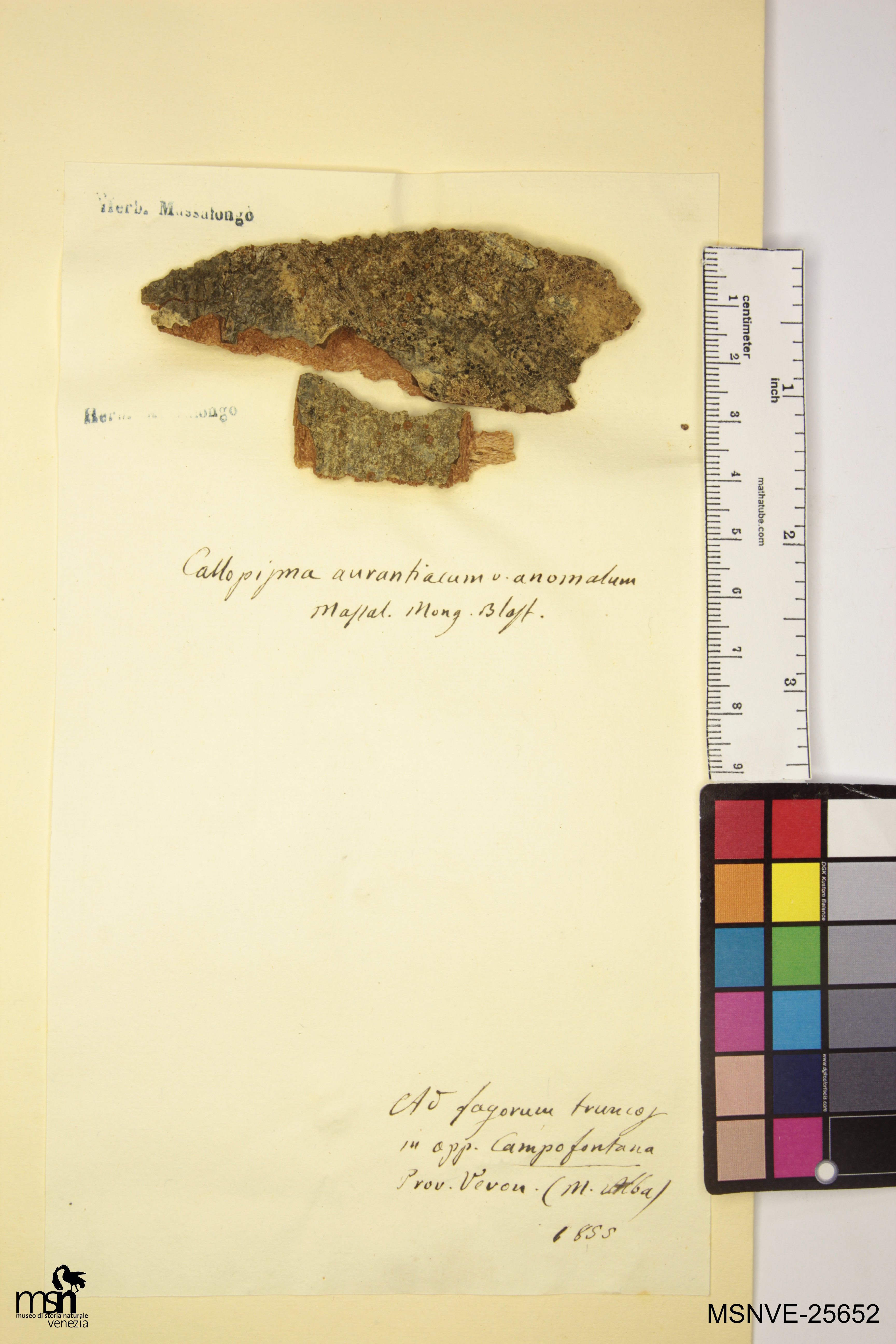 Trascrizione del cartellino verbatim: Callopisma aurantiacum v. anomalum Massal. Mong. Blast. Ad fagorum truncos in opp. Campofontana Prov. Veron. (M. Alba) 1855