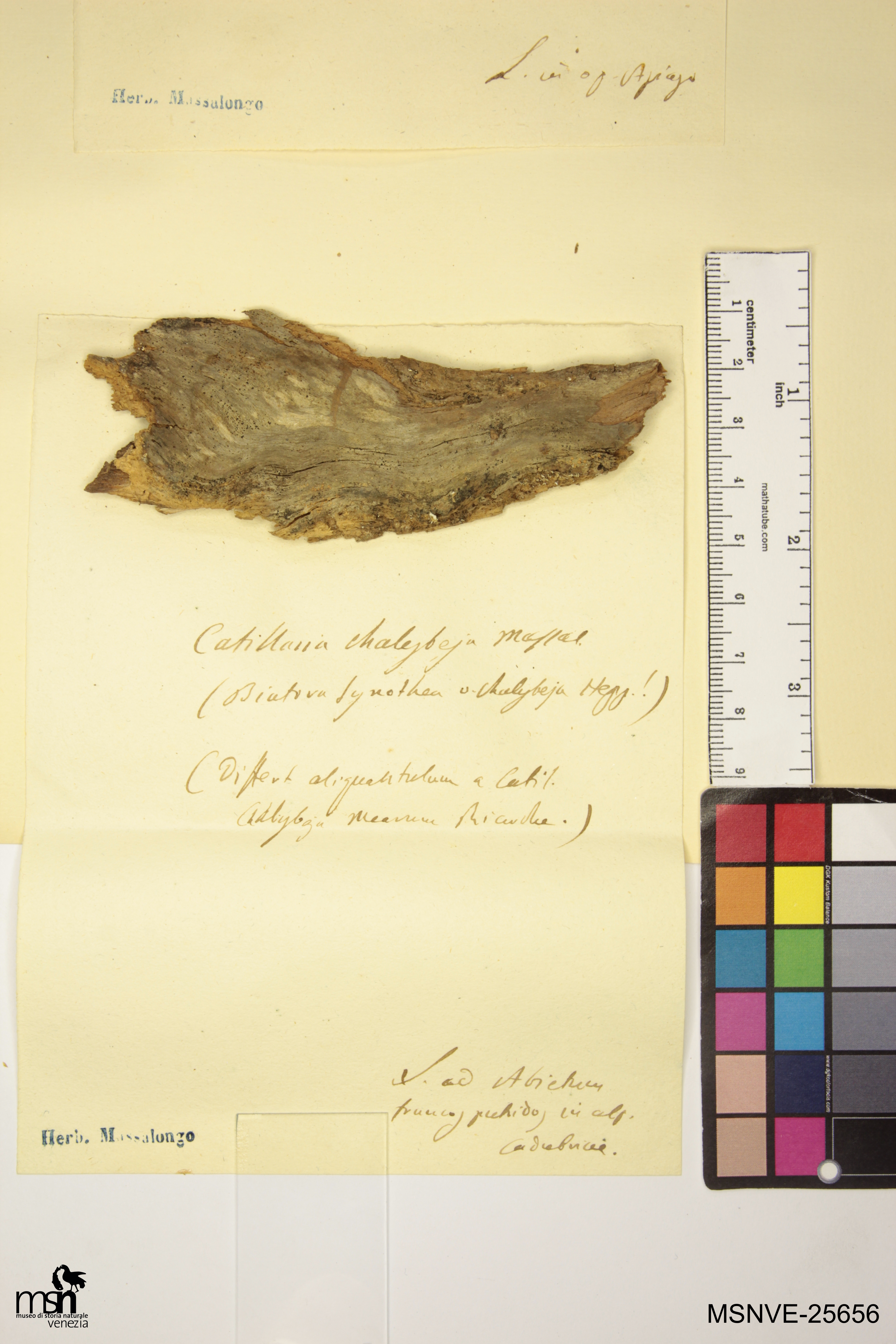 Trascrizione del cartellino verbatim: Catillaria chalybeja Massal. (Biatora synothea v. chalybeja Hepp!) (differt aliquantulum a Catil. Chalybeja mearum Ricerche.) L. ad Abietum truncos putridos in alp. Cadubriae