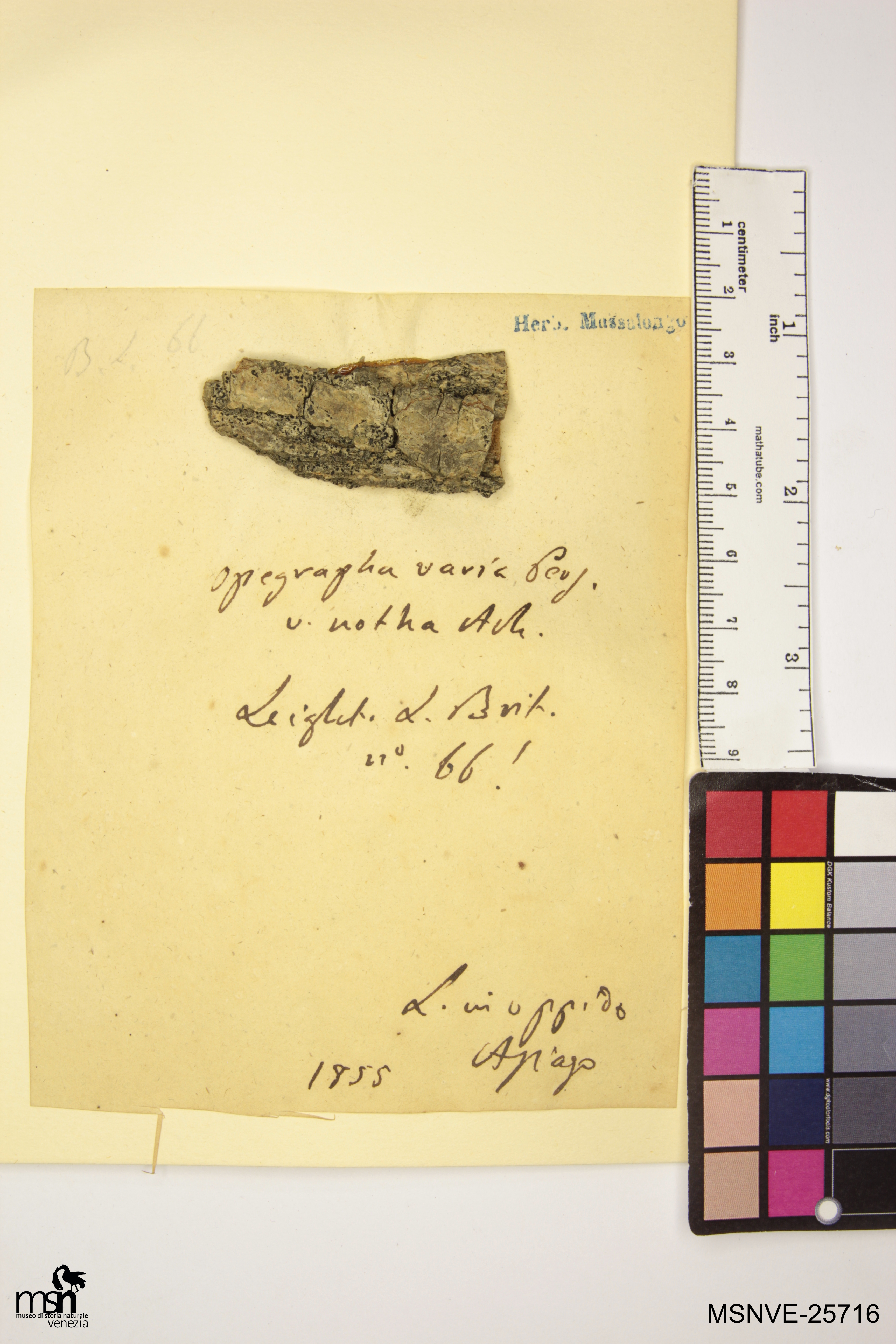 Trascrizione del cartellino verbatim: Opegrapha varia Pers. v. notha Ach. Leight. L. Brit. n°. 66! L. in oppido Asiago 1855