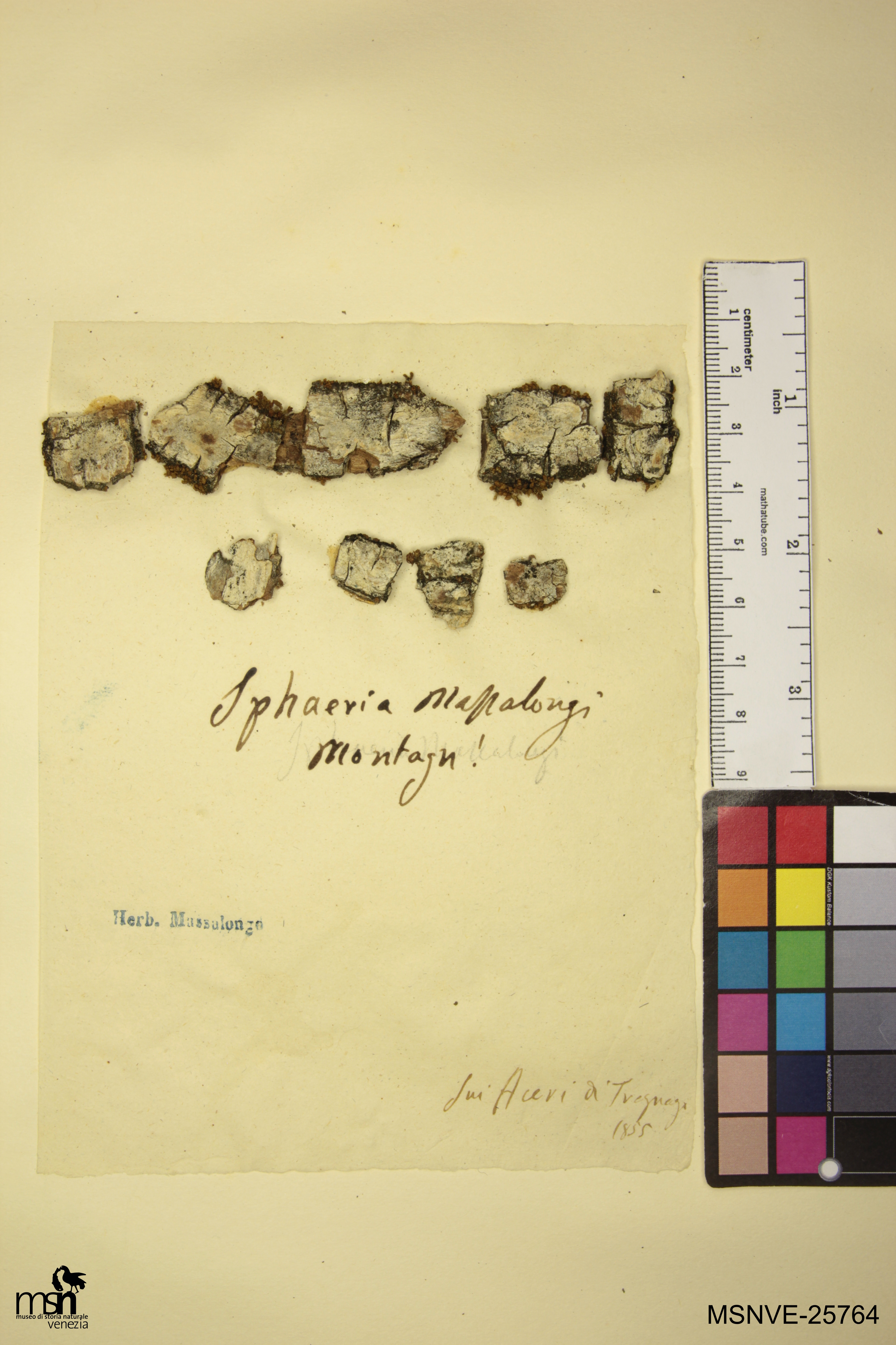 Trascrizione del cartellino verbatim: Sphaeria Massalongi Montagn! Sui Aceri di Tregnago 1855