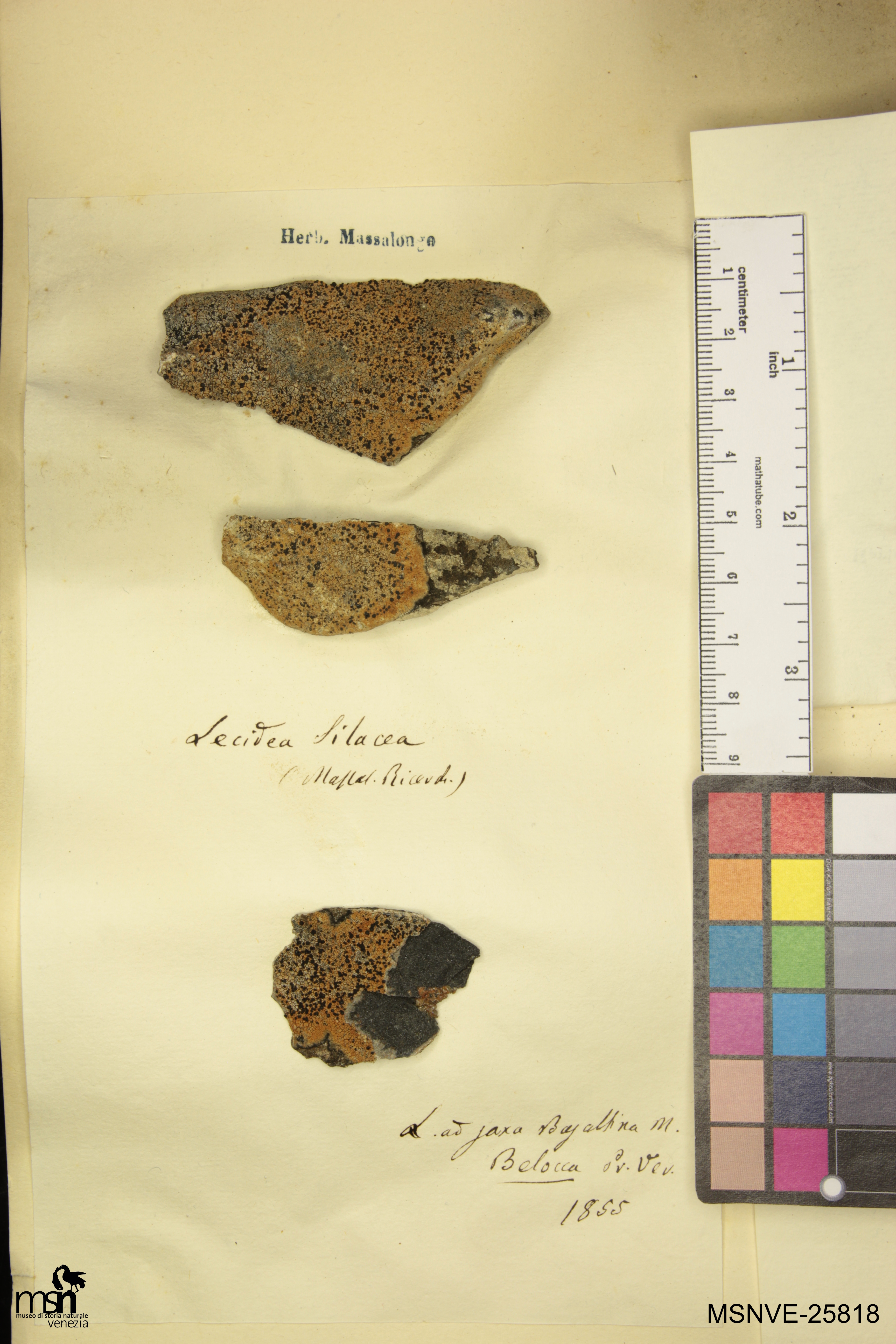 Trascrizione del cartellino verbatim: Lecidea Silacea (Massal. Ricerch.) L. ad saxa Basaltina M. Belocca Pr. Ver. 1855