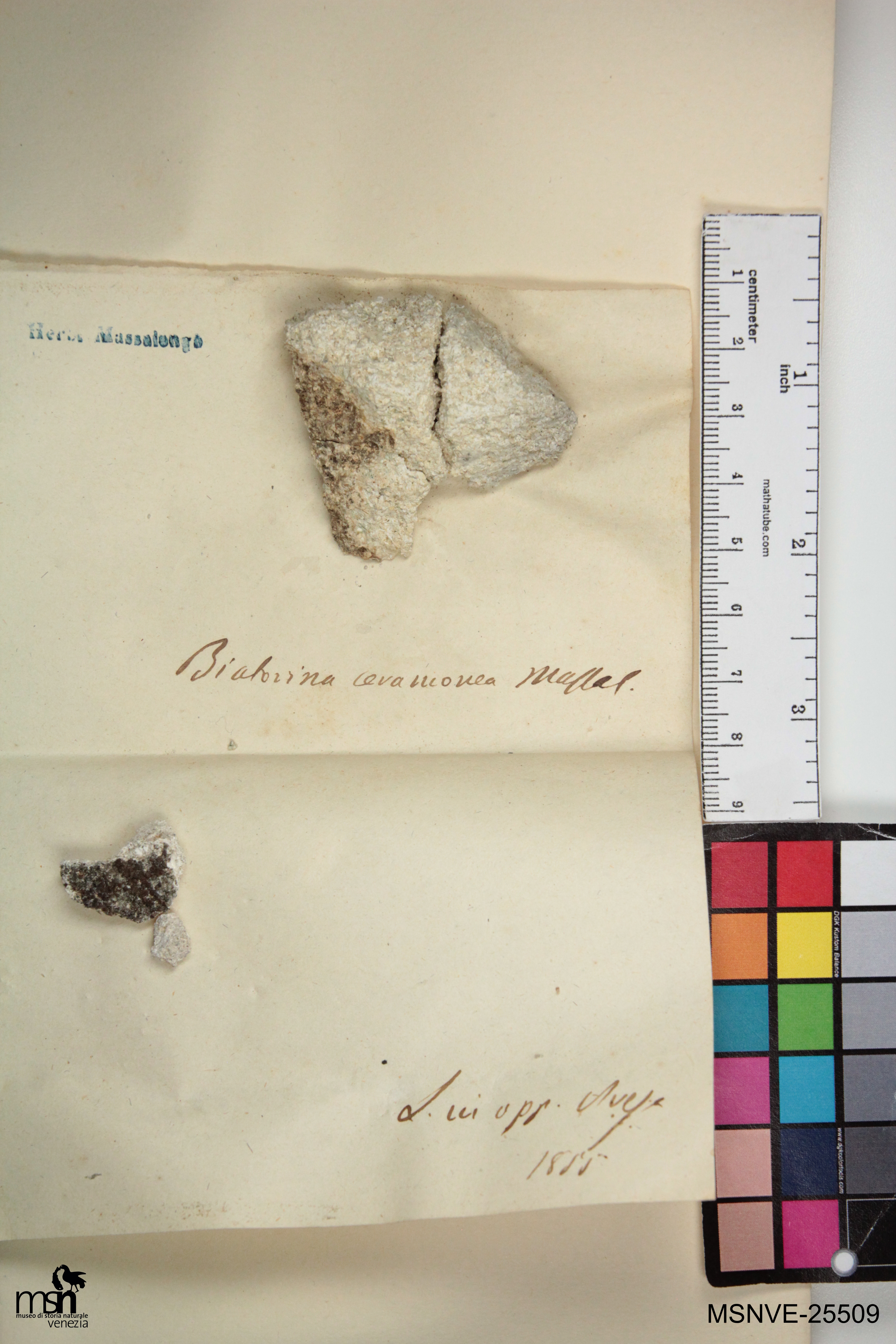 Verbatim label transcription: Biatorina ceramonea Massal. L. in opp. Avesa 1855