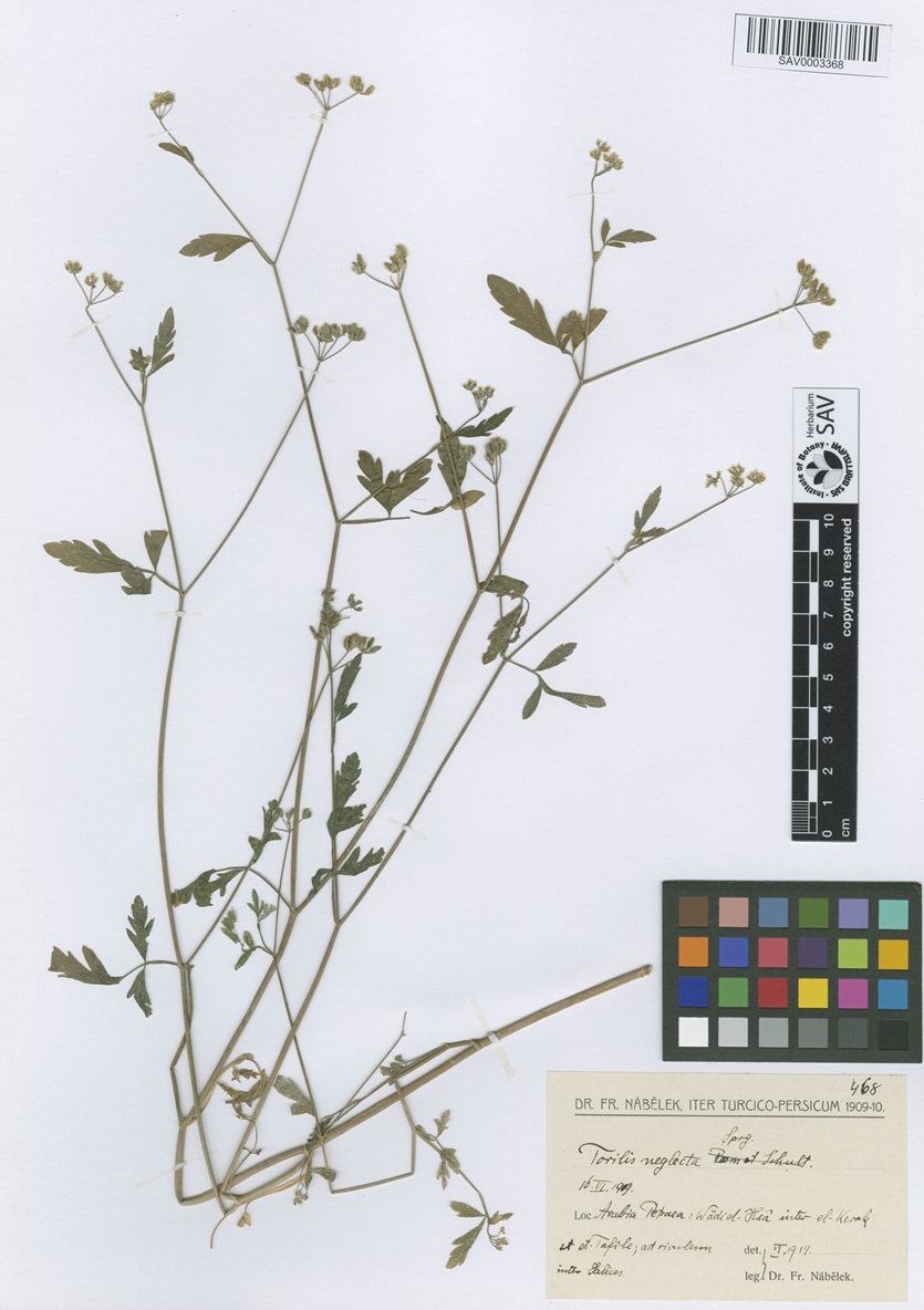 Sinonimi / Synonyms: Scandix infesta sensu Jacq.; Torilis infesta (L.) Clairv.; Torilis infesta (L.) Spreng. subsp. neglecta (Spreng.) Coutinho; Torilis infesta (L.) Spreng., isonym; Torilis neglecta Spreng.;