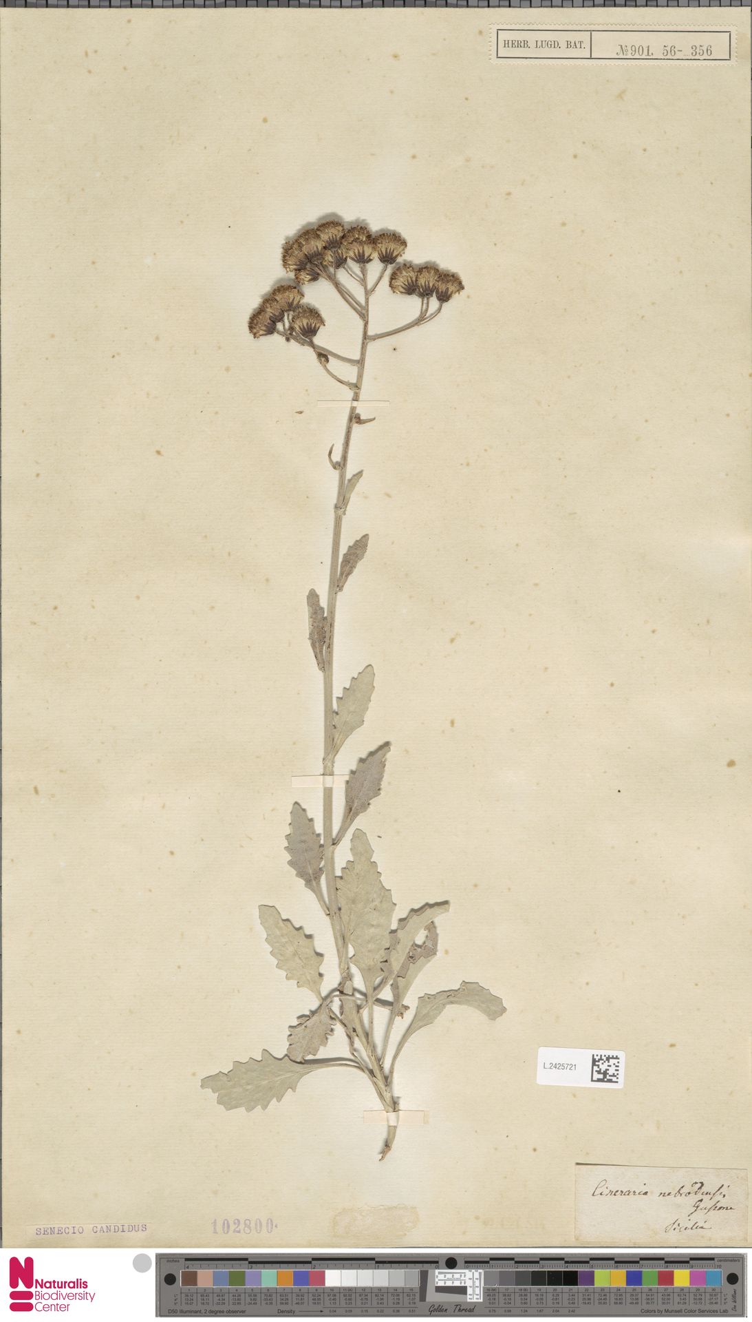Sinonimi / Synonyms: Cineraria nebrodensis Guss.; Jacobaea candida (C.Presl) B.Nord. & Greuter; Senecio ambiguus (Biv.) DC. subsp. nebrodensis (Guss.) Peruzzi & N.G.Passal.; Senecio bicolor (Willd.) Tod. subsp. nebrodensis (Guss.) Chater; Senecio candidus (J. & C.Presl) DC.; Senecio cineraria DC. subsp. nebrodensis (Guss.) Mabb.;